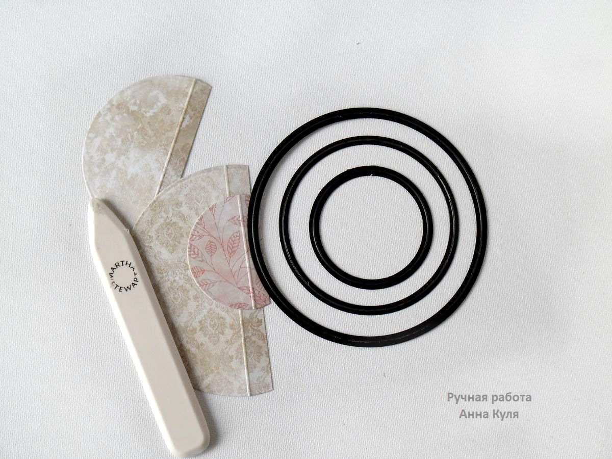 Итак, для открытки использовала остатки от коллекции Bee Shabby "Happiness" (небольшие кусочки, которые остались от шебби альбома), ножи для вырубки "круг" (можно заменить на любые предметы, которые можно обвести), еще понадобится линейка, макетный нож, ножницы, клей.
