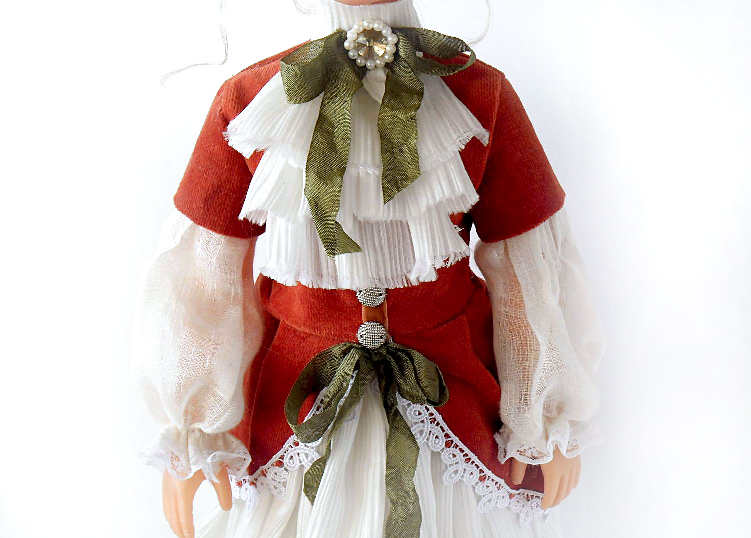 Эта большая кукла лежала почти год у меня в кабинете и захотелось снять эти китайские тряпки из ужасных тканей. Сшила наряд пару недель назад, а вот только руки дошли фото сделать и обработать. Я не знала какой образ получится, просто достала с полки пару кусочков тканей и за пару выходных вечеров собрала ей ансамбль.